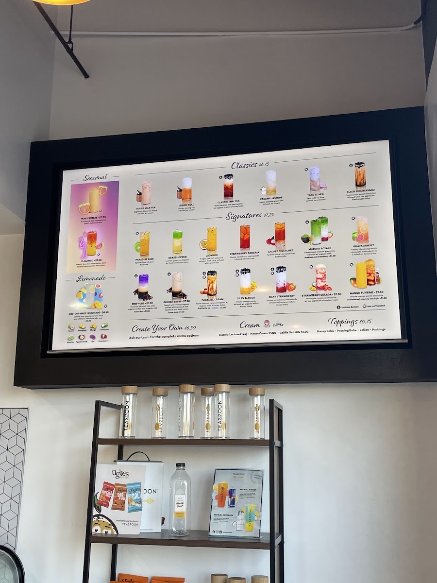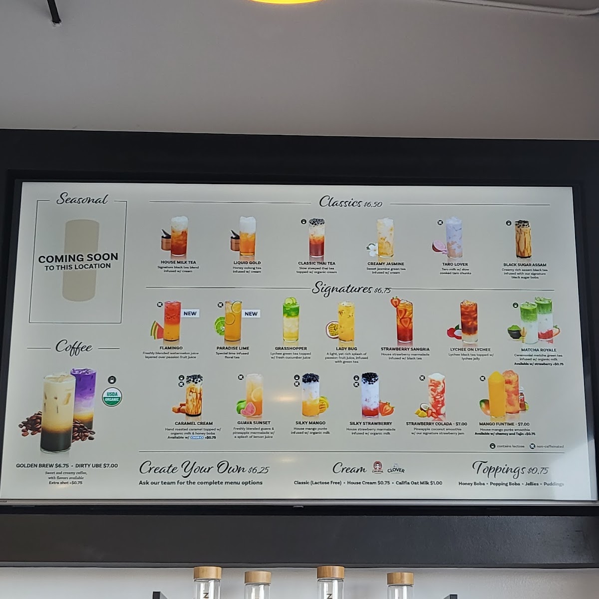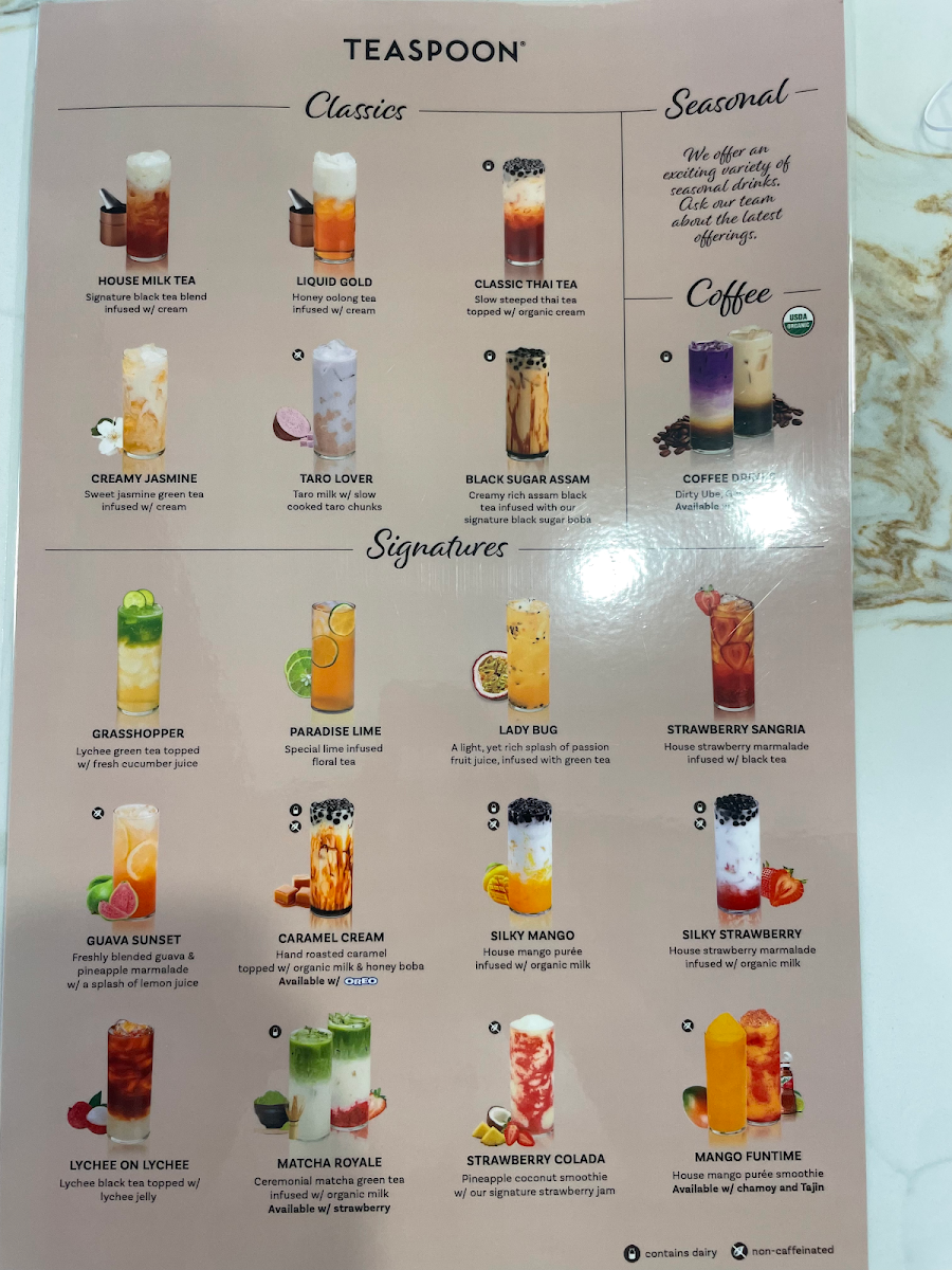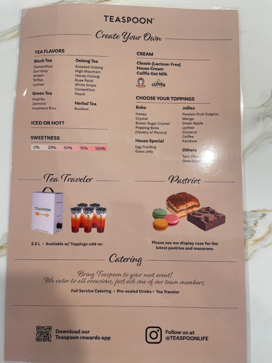From a reviewer’s perspective, the menu at Teaspoon Santa Rosa offers a wide and creative selection of drinks and snacks that cater to both classic milk tea lovers and those looking for unique flavors. Popular choices like Vietnamese Coffee, Creme Brulee Coffee, Guava Sunset, Classic Thai Tea, and Caramel Cream highlight the shop’s strength in rich, flavorful beverages, while newer additions such as Tiramisu Latte, Cupid's Kiss, and Hoji Cookies And Cream bring a fun, seasonal twist. The classics, including House Milk Tea, Liquid Gold, Creamy Jasmine, and Taro Lover, provide reliable options for traditional tea fans, while signature drinks like Double Matcha, Custom-Made Lemonade, Pineapple Shine, and Grasshopper showcase more inventive combinations. Coffee lovers can enjoy variations like Ube Vietnamese Coffee, Coconut Coffee, and Vietnamese Frappé. The menu also includes customizable teas such as Assam Black Tea, Earl Grey Black Tea, and Lychee Black Tea, along with snacks like Macaron 6 Pc, Marshmallow Bar, and Chocolate Brownie. Overall, the menu feels diverse and well-rounded, with options ranging from classic milk teas to specialty drinks and desserts, making it a great spot for both quick treats and group orders with items like House Milk Tea - Party Pour and Tea Traveler selections.